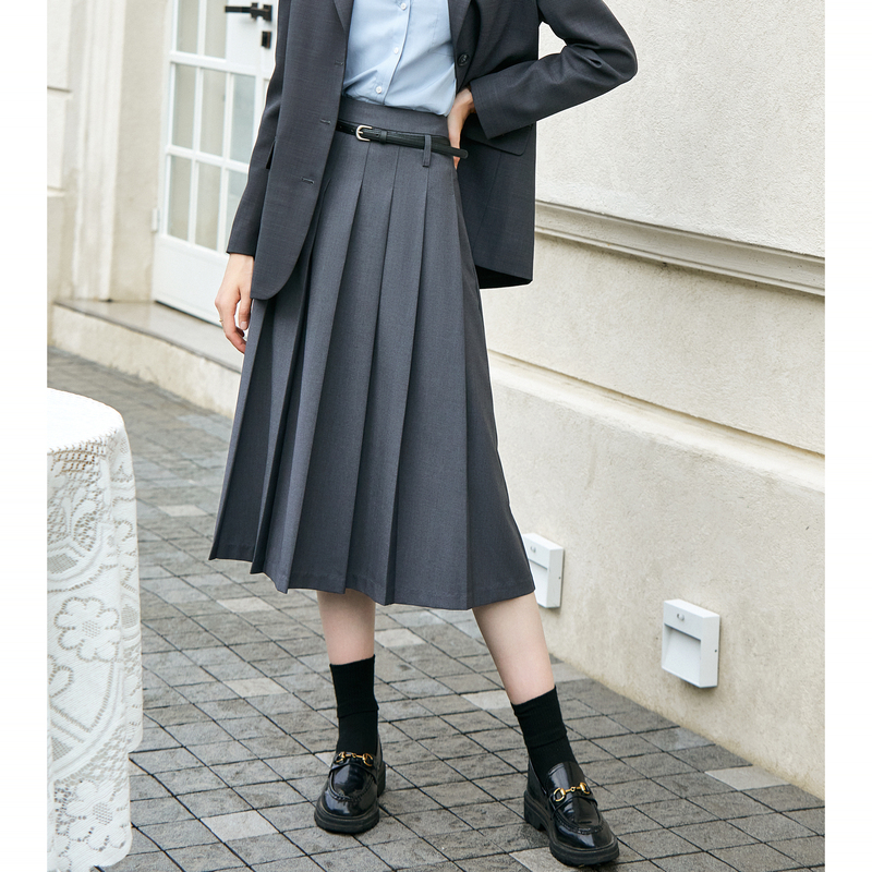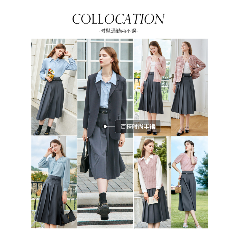 中长款 春装 气质复古百褶裙 高腰灰色百褶裙 百图