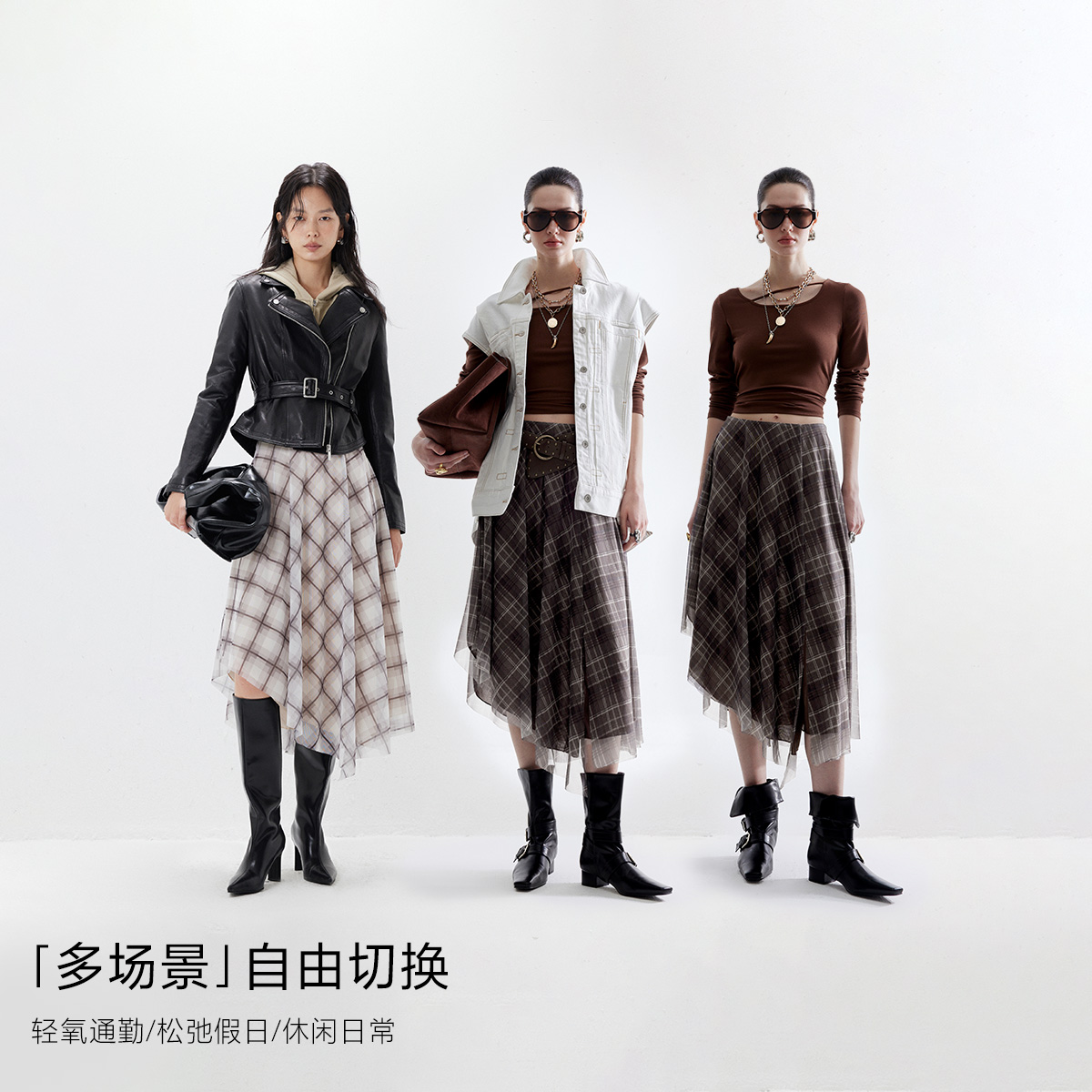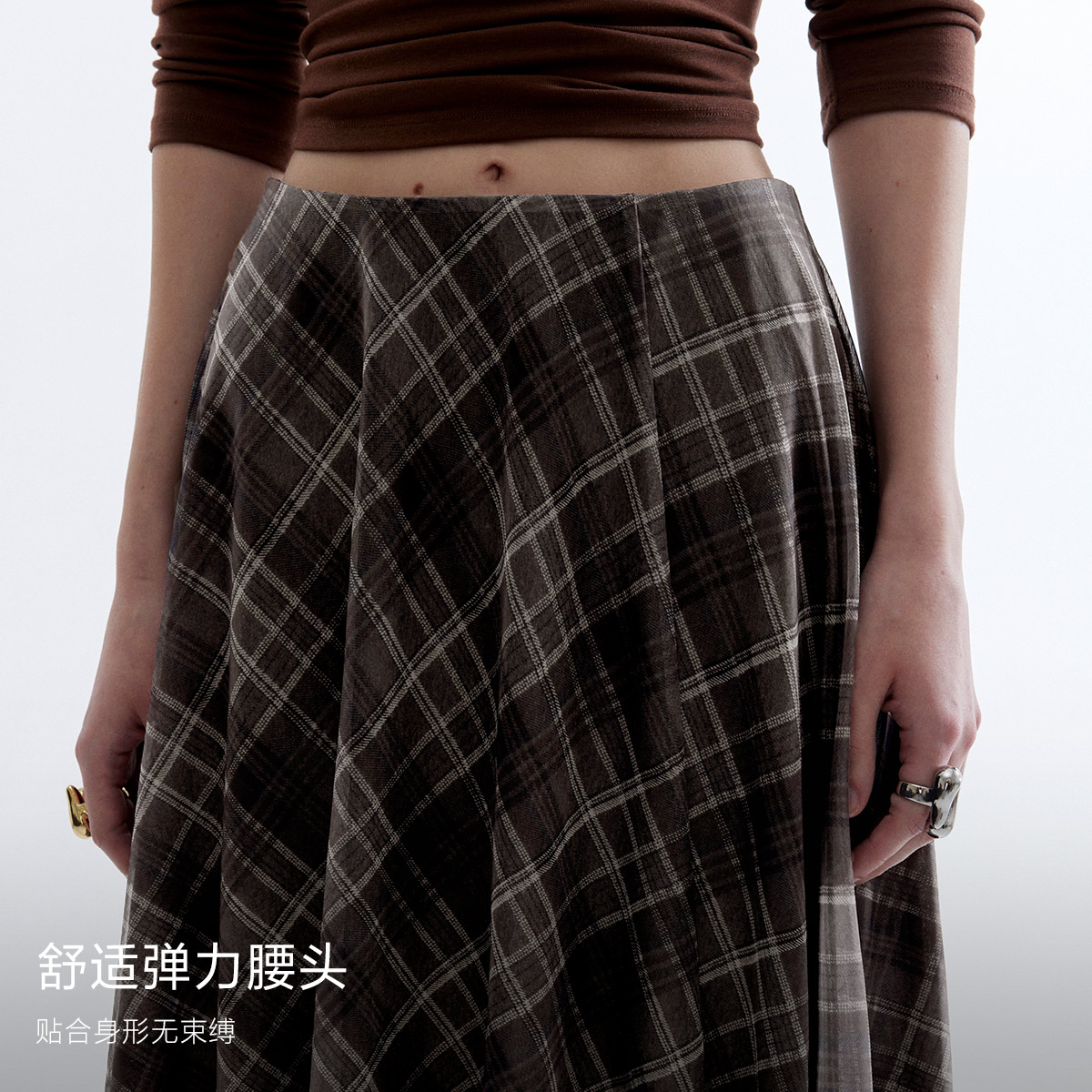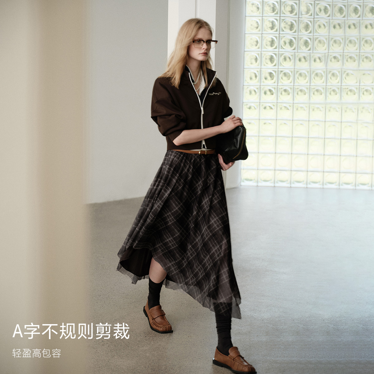 新款 ONLY2025秋季 格纹印花网纱A字中长半身裙女 新派学院系列