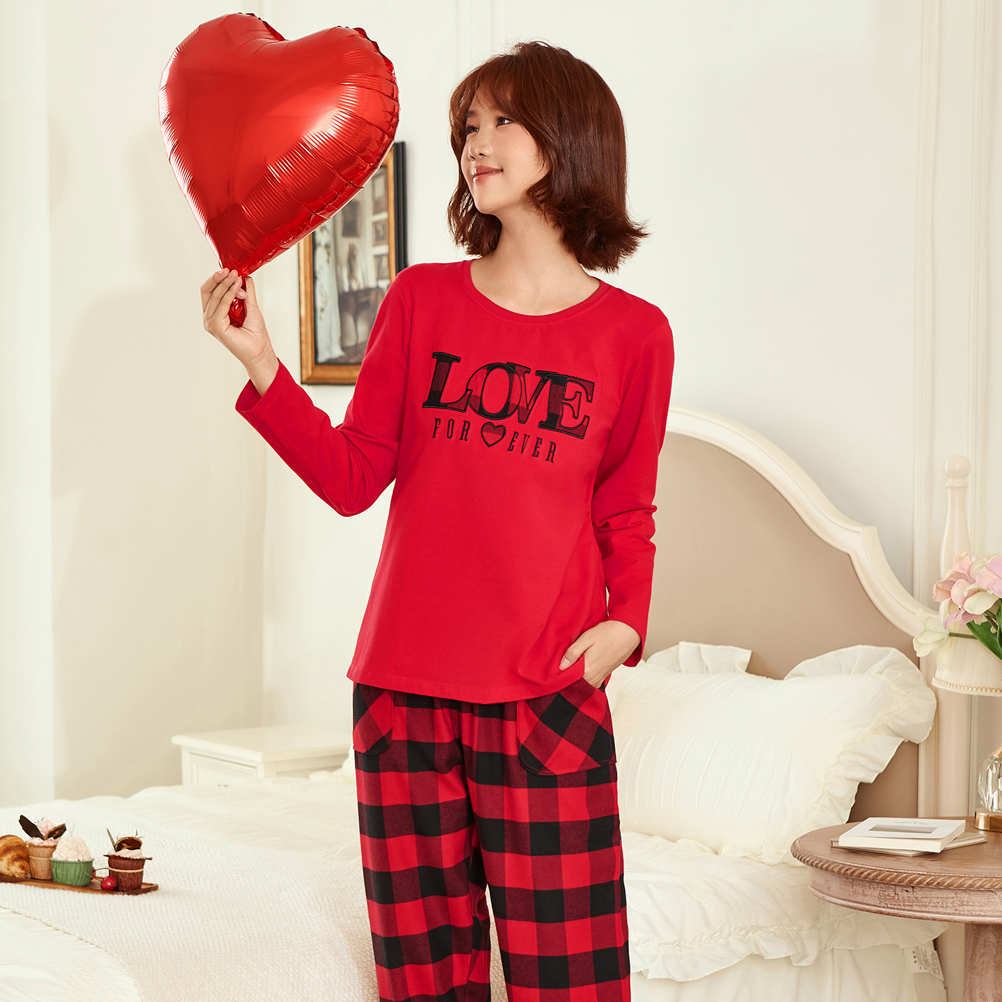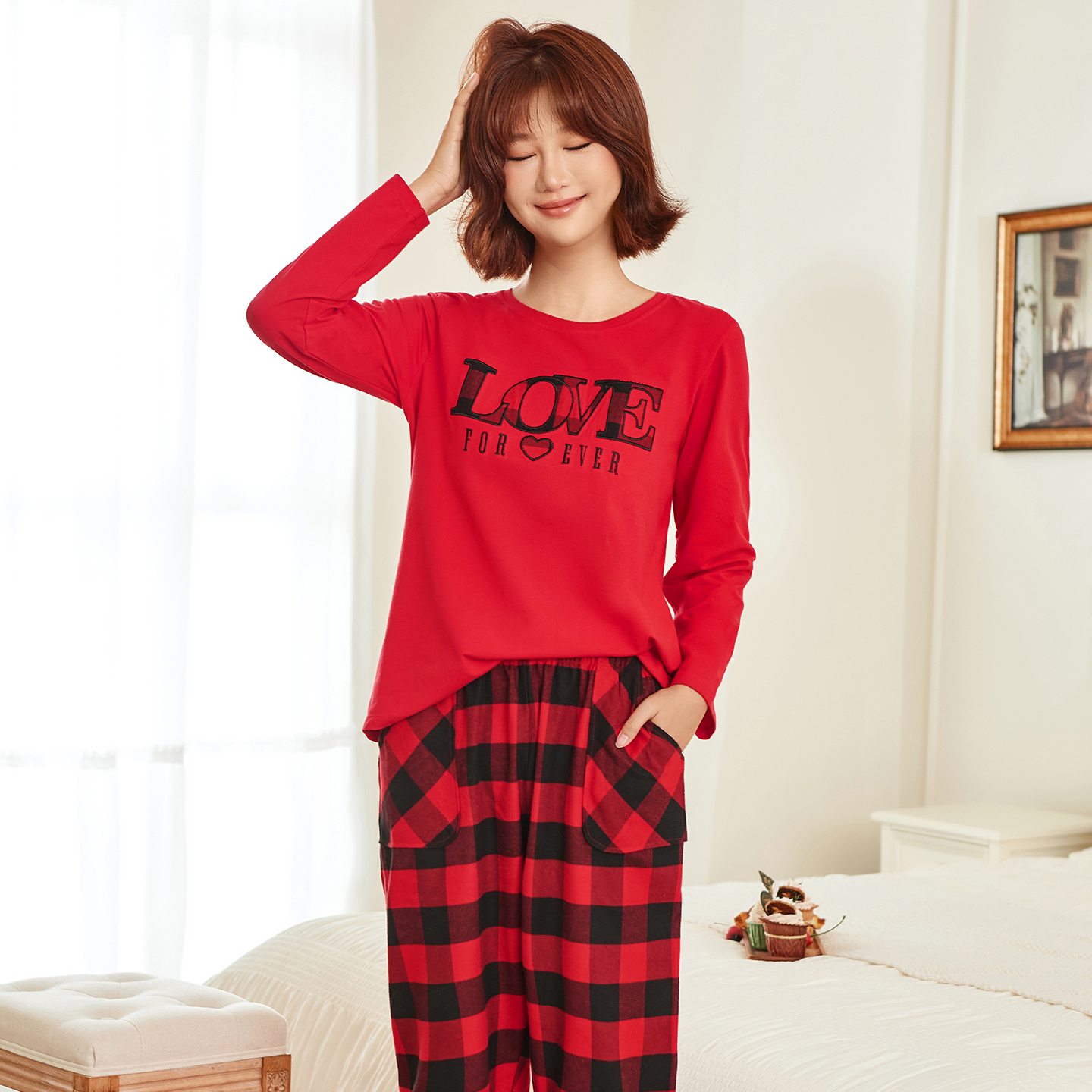 格子服饰 春秋款 睡衣女秋冬新年红色女款 纯棉家居服结婚喜庆秋冬季