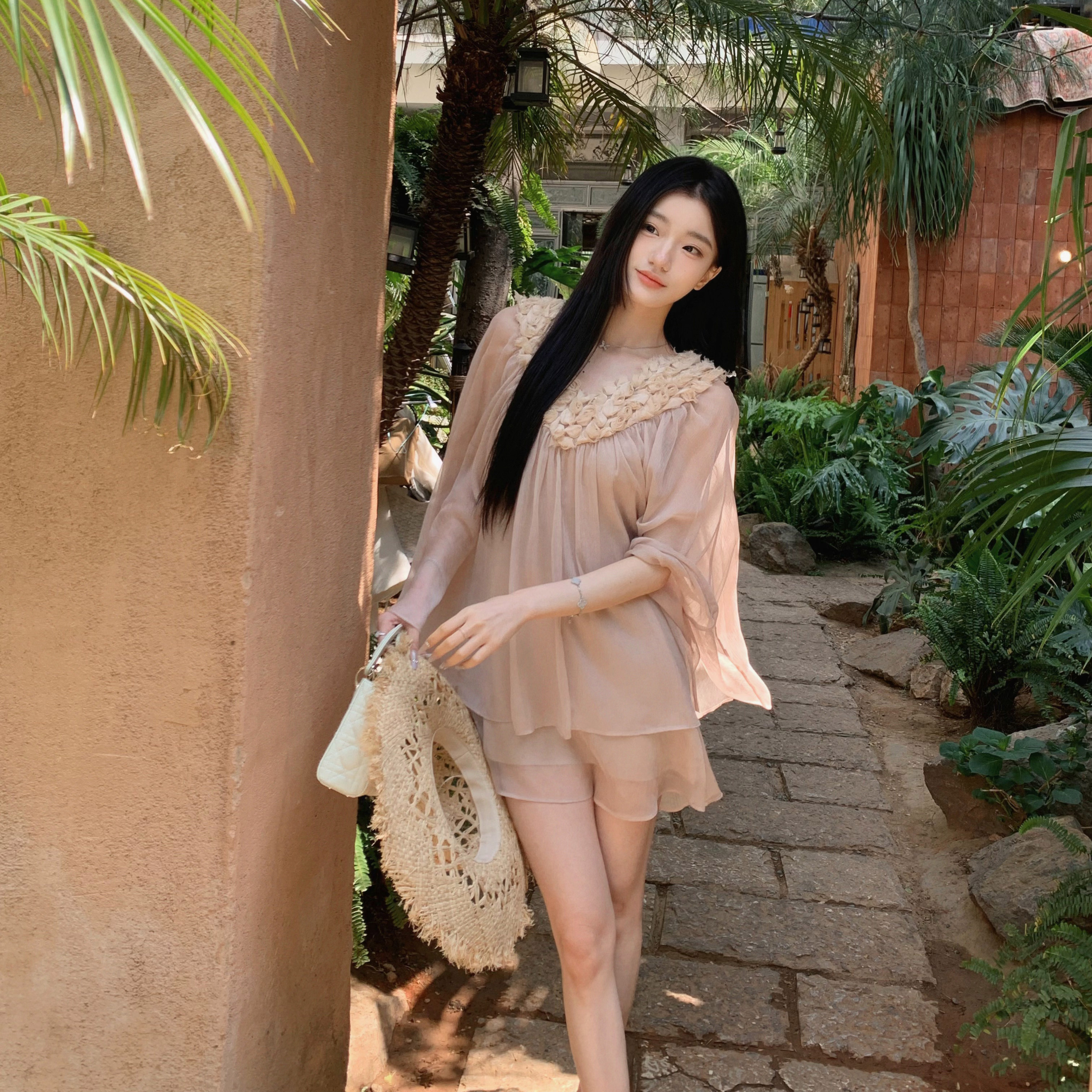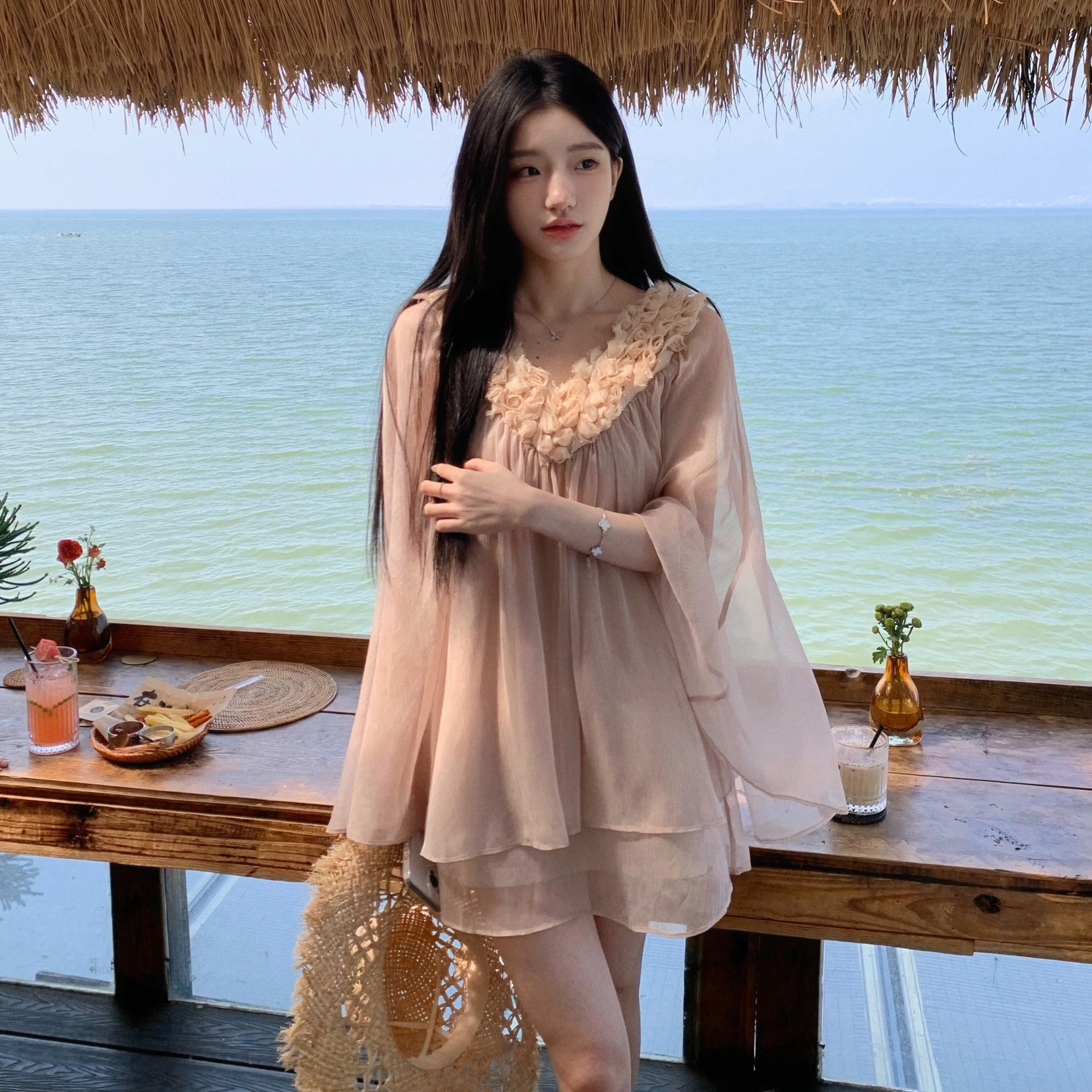 松弛感v领花朵连衣裙温柔别致防晒短裙 温柔预报员 YYW汪澜 妹妹