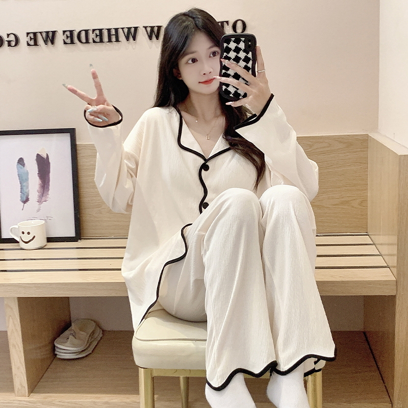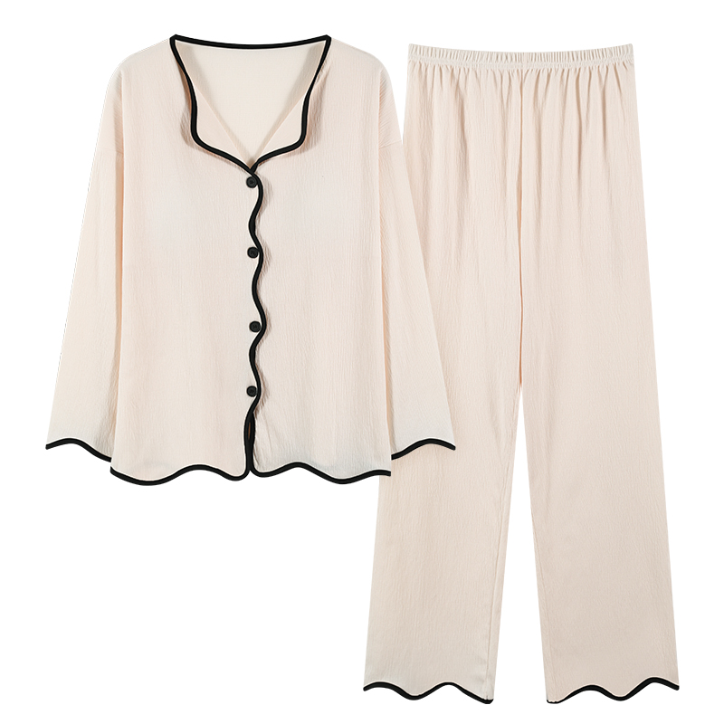 夏冬款 自带胸垫一体开衫 女士春秋季 睡衣套装 纯色家居服 皱棉长袖