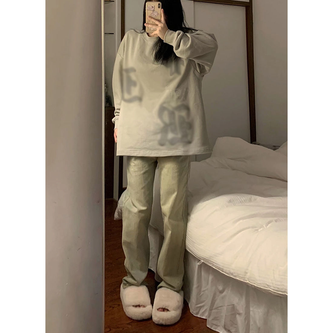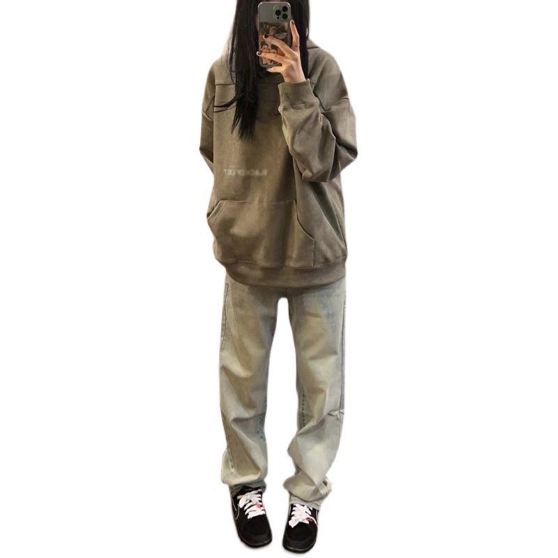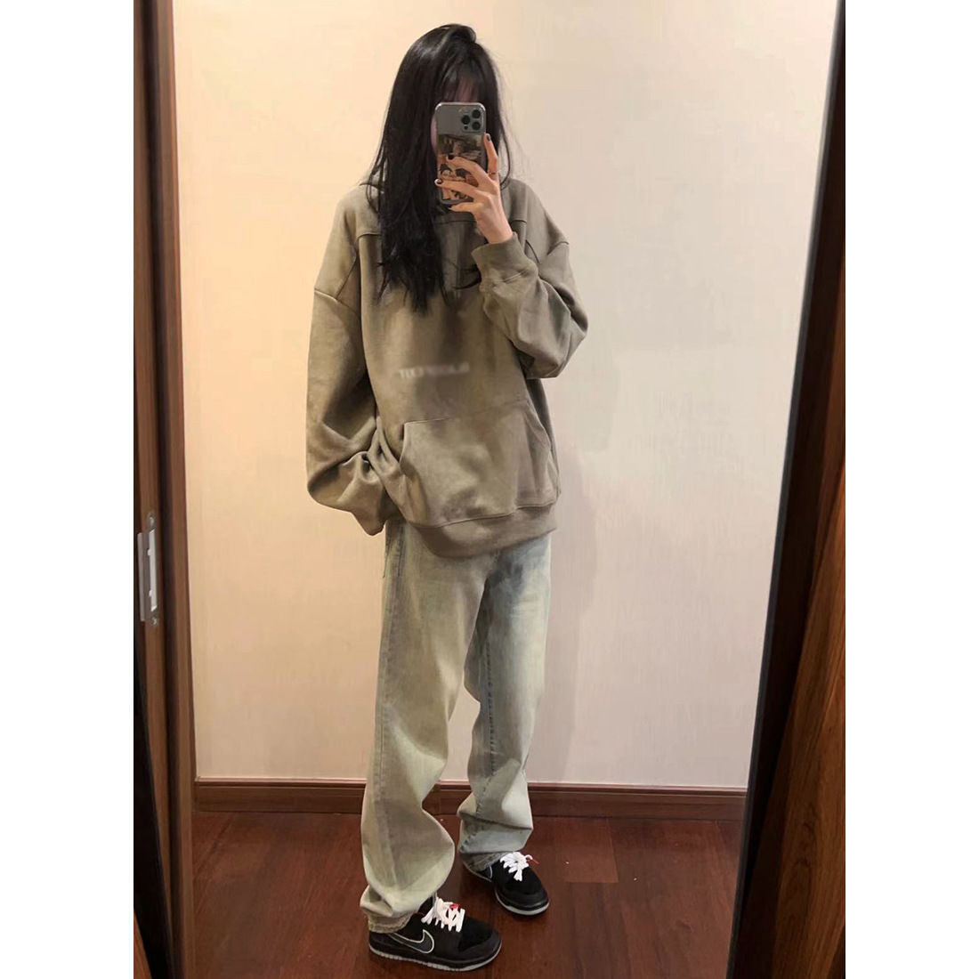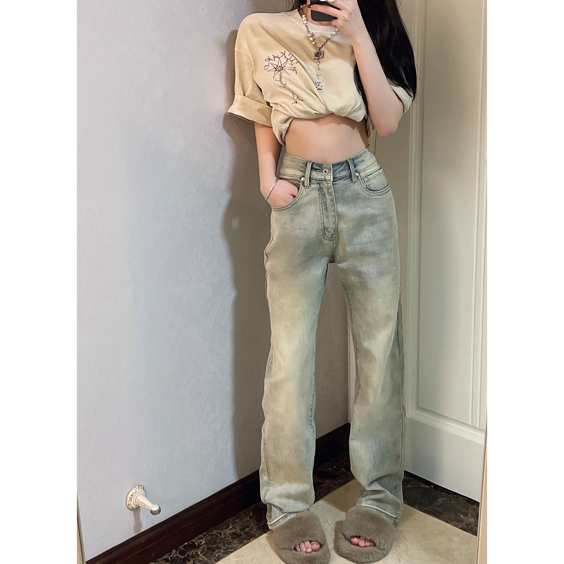 百搭牛仔裤 水洗做旧直筒拖地长裤 男女同款 高街美式 黄泥色新款 韩版