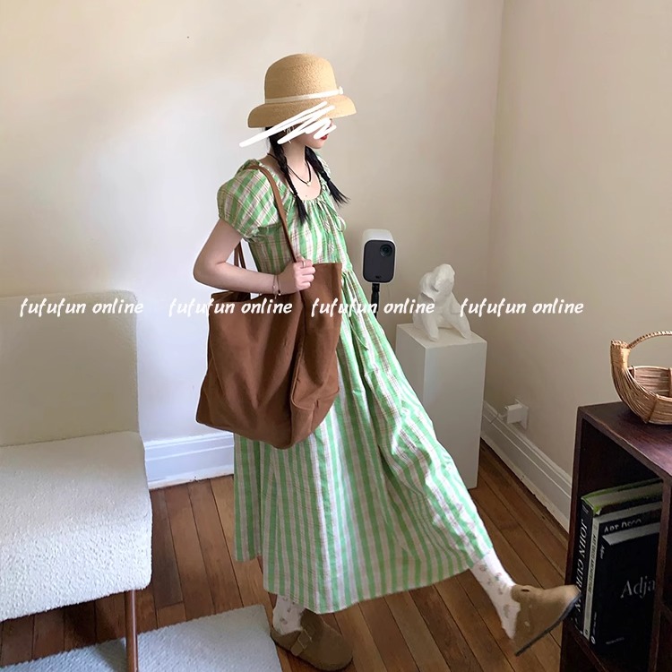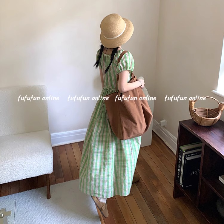 fufufun「蜜瓜奶绿」原创重工蜜瓜绿日系格纹可抽绳系带连衣裙