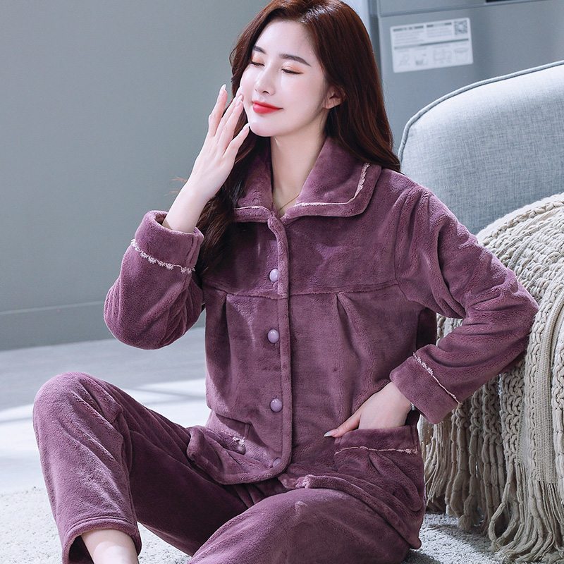 法兰绒冬天套装 秋冬季 女士加厚珊瑚绒睡衣女冬家居服春秋毛绒大码