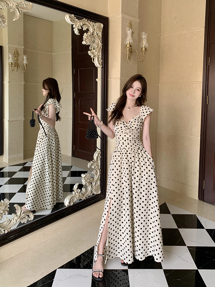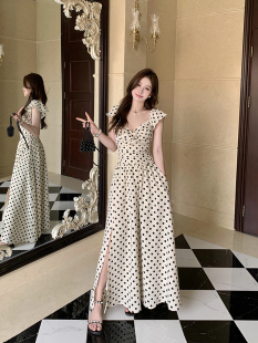 褶皱收腰显瘦气质长款 2025年大码 新款 高级感波点连衣裙夏季 女装