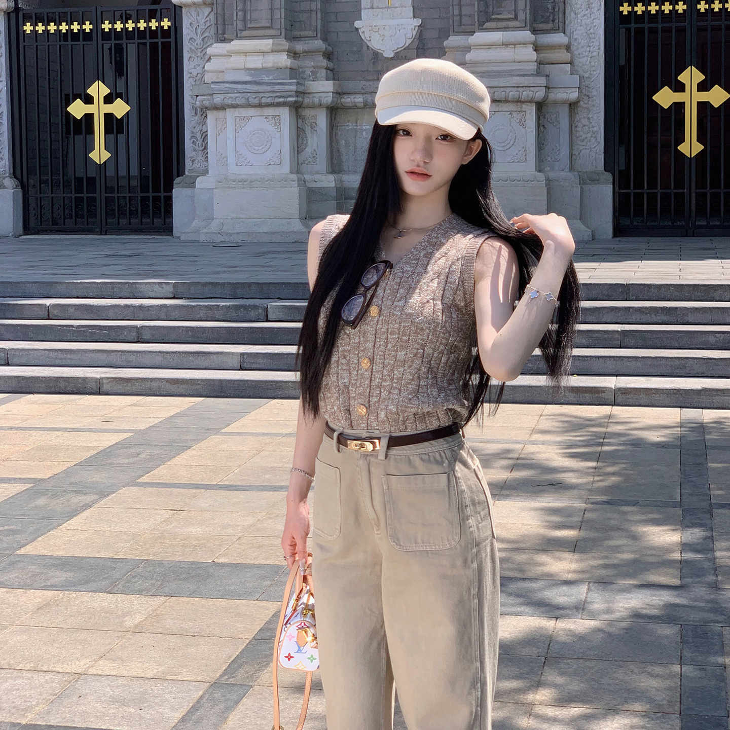 高腰直筒显瘦长裤 YYW汪澜 纯棉麻花针织马甲套装 焦糖晚风 妹妹
