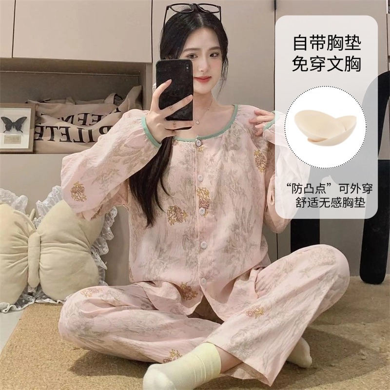 韩系家居服套装 秋冬带胸垫睡衣女2025新款 开衫 长裤 云朵棉长袖