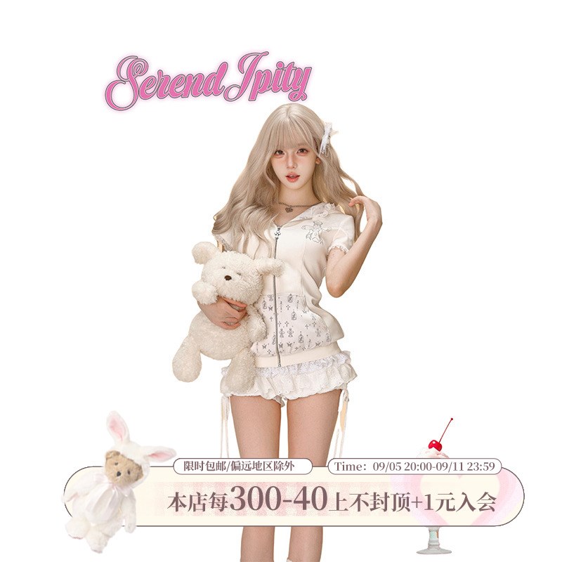 卫衣 少女椰子甜辣系 蕾丝边短袖 初秋套装 蛋糕裙半身裙 十字兔偶