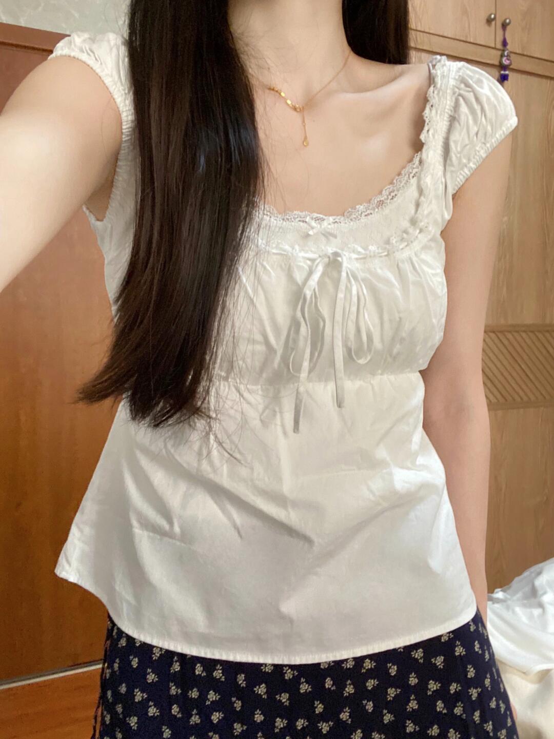 衬衣修身 韩系娃娃领波点短袖 蕾丝小飞袖 女夏季 显瘦学院风上衣 衬衫