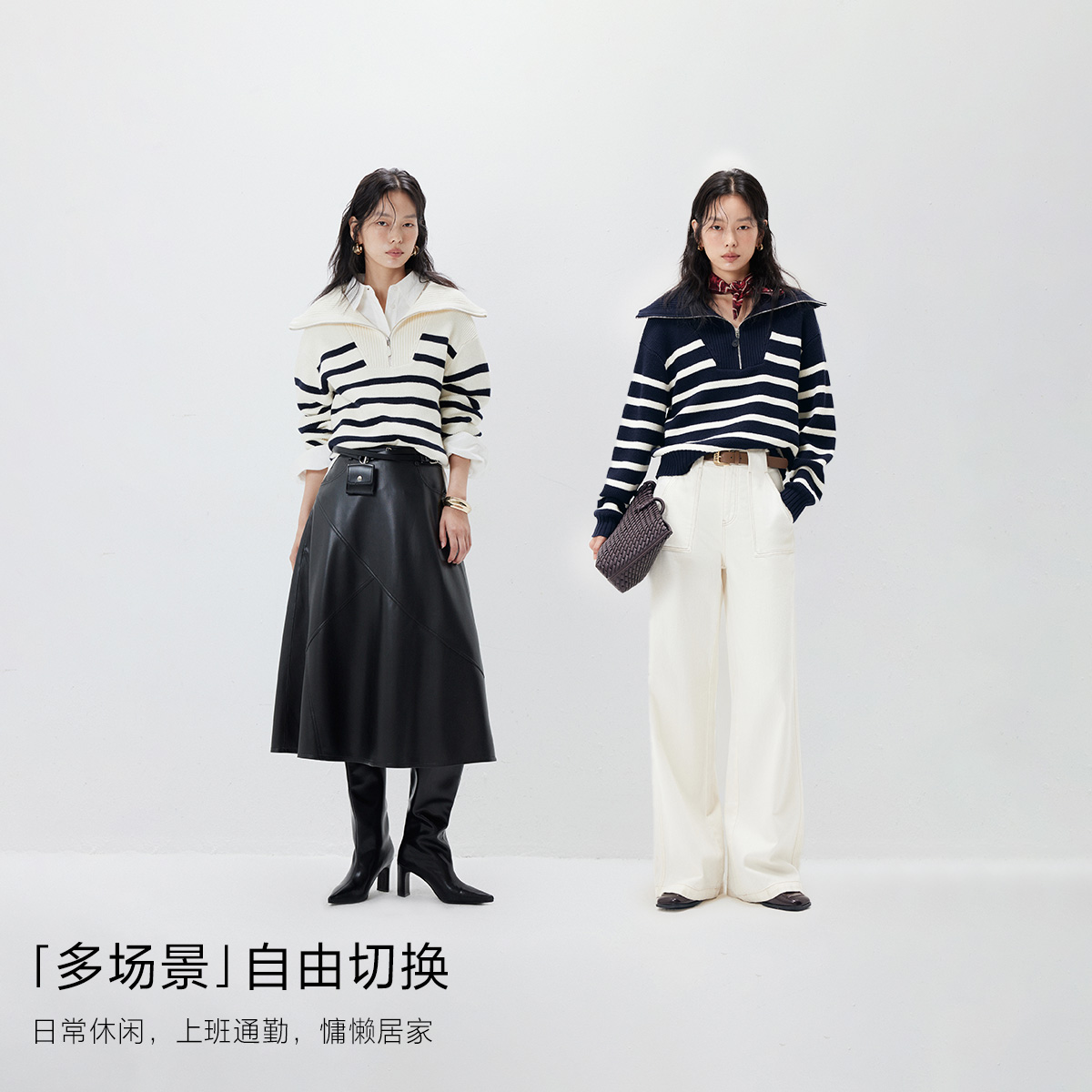 海军大翻领落肩条纹针织衫 新款 ONLY2025秋季 女 新派学院系列