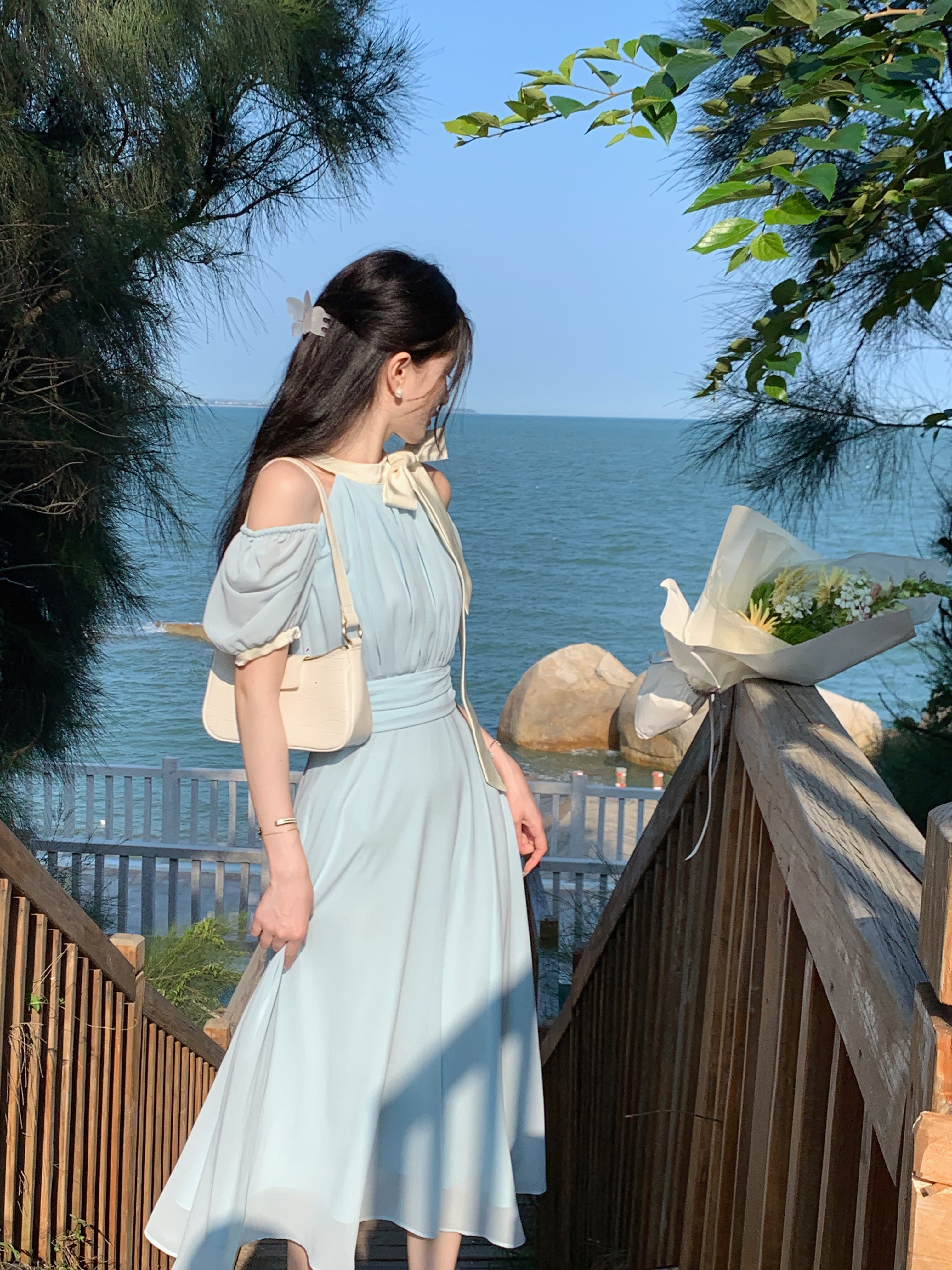 妹妹 短款 海盐味 长 露肩系带设计感温柔连衣裙 夏天 YYW汪澜