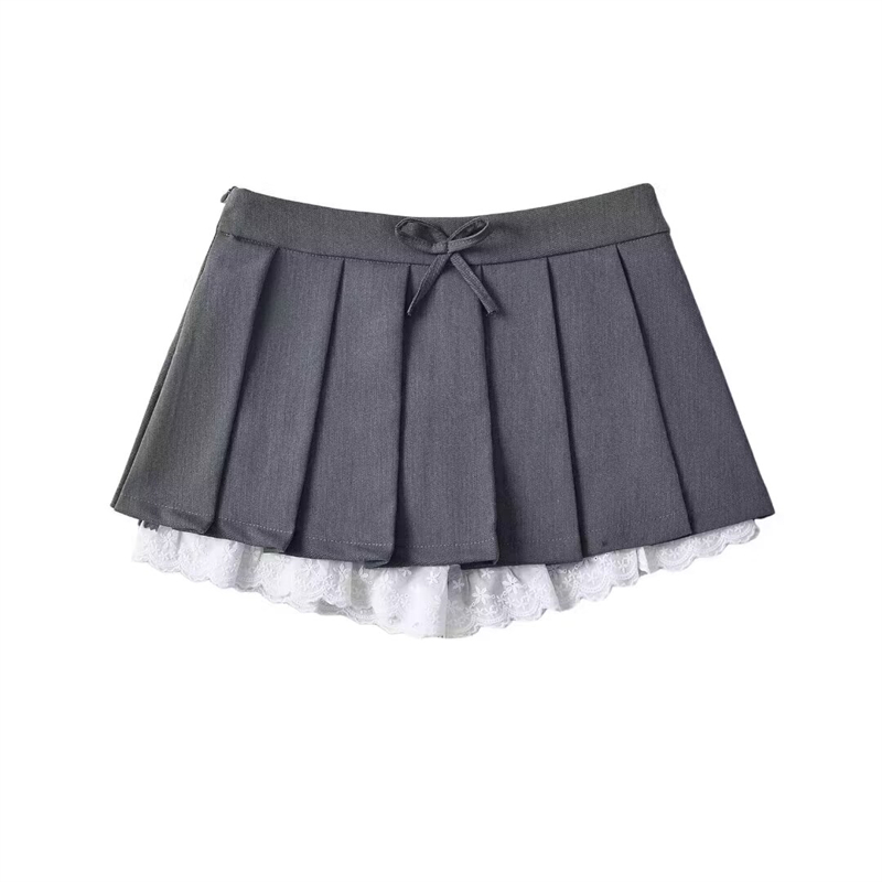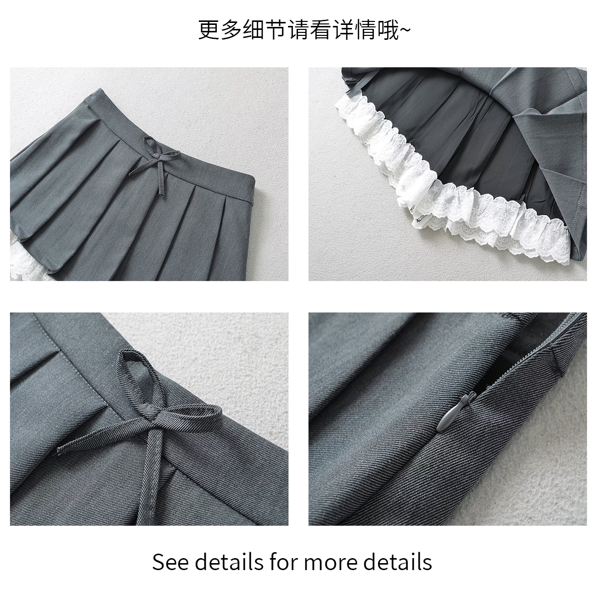 美式 学院风jk短裙蝴蝶结蕾丝花边A字半身裙小个子灰色百褶裙夏季