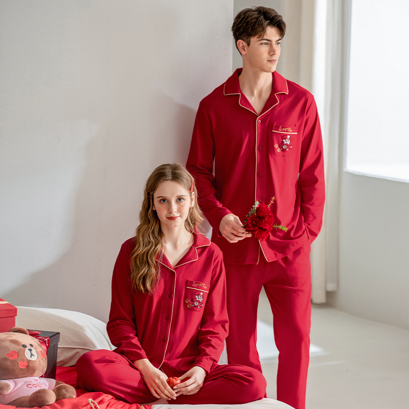 红豆红情侣睡衣纯棉家居服男新婚结婚嫁娶本命年红色套装 春秋