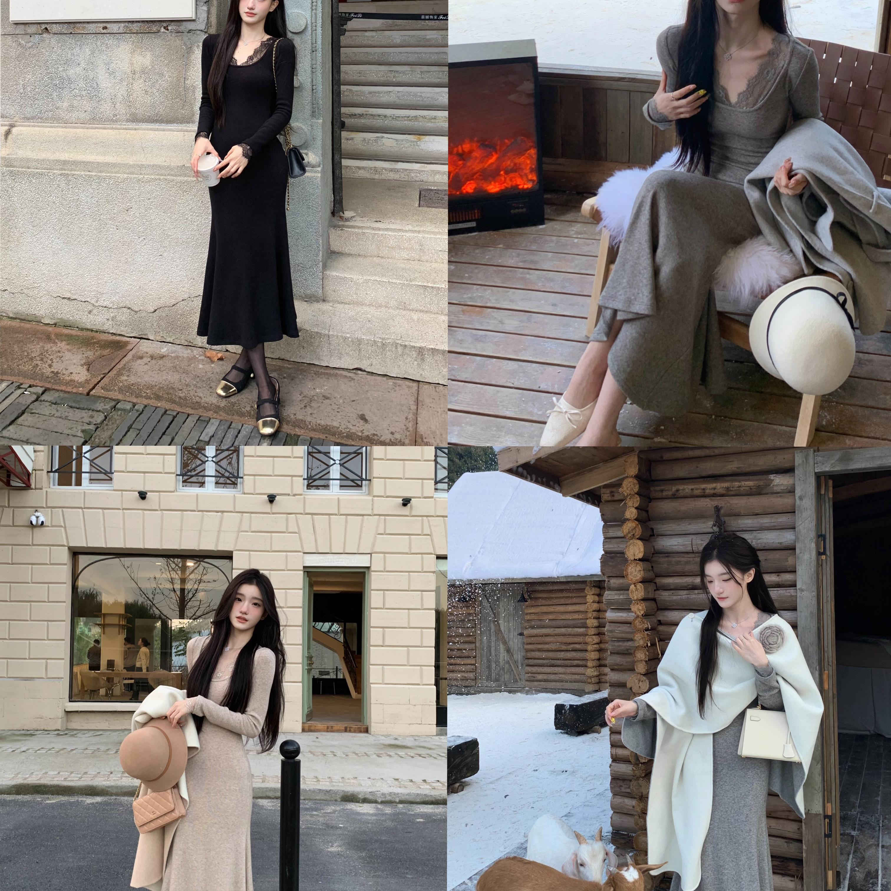 YYW汪澜 3色蕾丝拼接微鱼尾内搭纯欲针织连衣裙 妹妹清冷缪斯