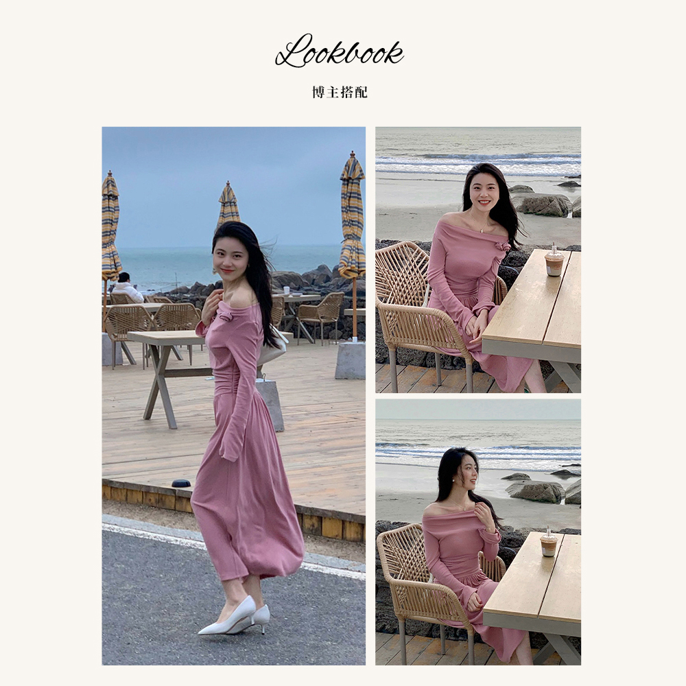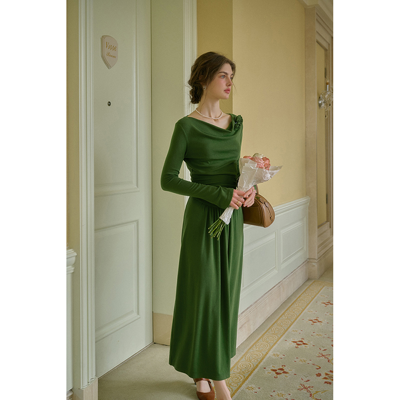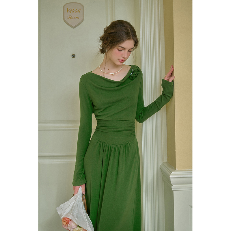 气质长裙 法式 SimpleRetro梦境仙踪 立体玫瑰荡领针织连衣裙女长袖